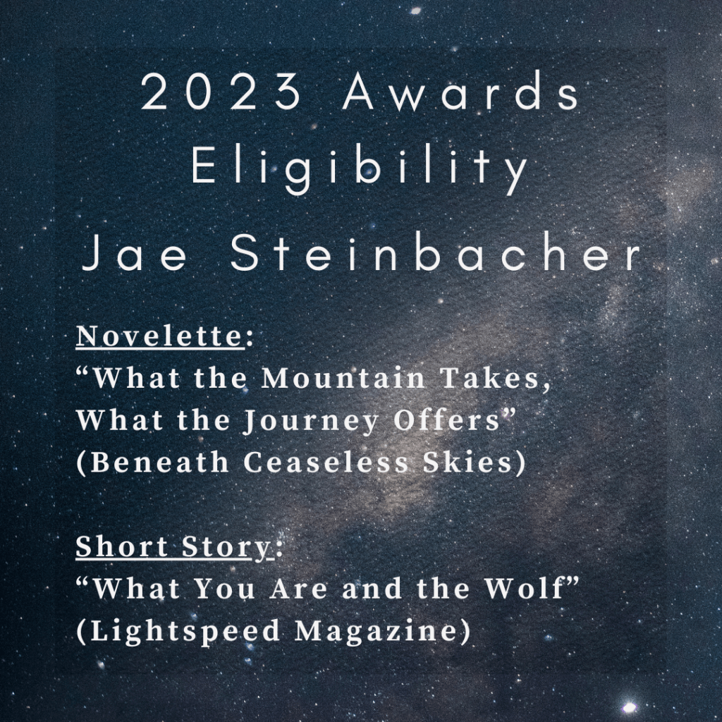 - Novelette: “What the Mountain Takes, What the Journey Offers”, published in Beneath Ceaseless Skies. A baker from a small village must make a dangerous trek to seek the cure for their wife’s fatal illness. They make friends and revelations along the way, lose some things in the process, and discover there may be more room in the world for people like them than they’d once thought.